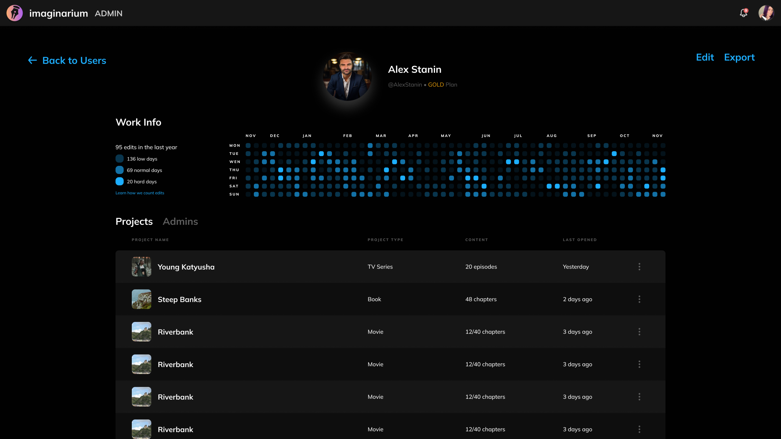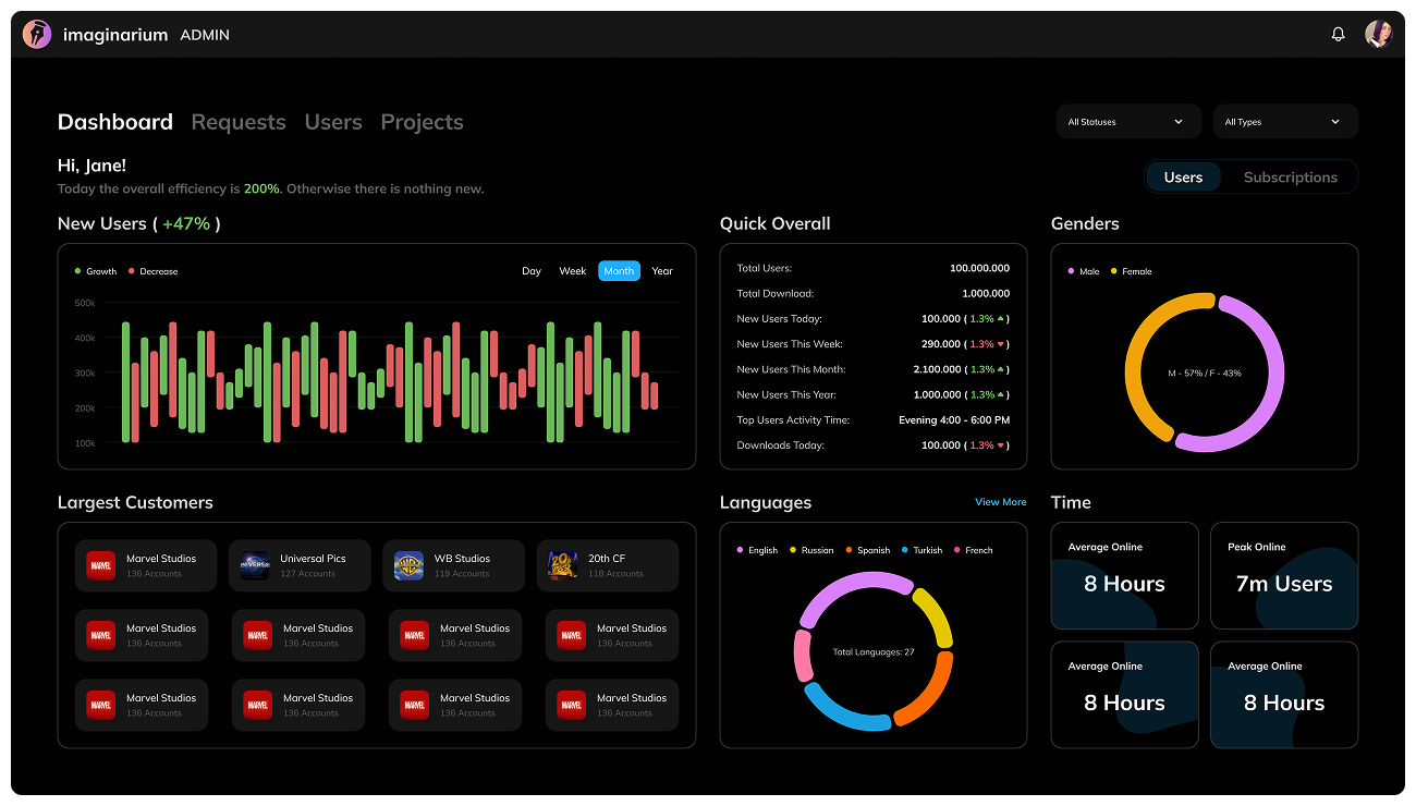 This project focused on building a separate internal application for the Imaginarium platform—the Admin Dashboard. This tool was created for internal stakeholders (e.g., operations, marketing, product leadership, and support teams) to manage user accounts, analyze platform activity, and monitor high-level business metrics.