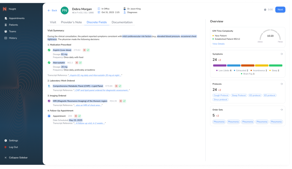 Structured fields now embedded directly in the interface. Smart defaults, validation, and tags support accurate input. Data now cleanly maps to EHR.