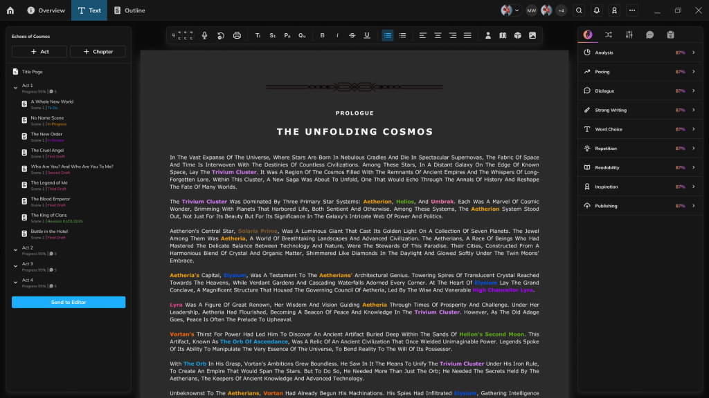 Feature identifies proper nouns and highlights names of characters and locations in real-time while writing. Helps maintain narrative continuity and enables future AI functions like character timelines.