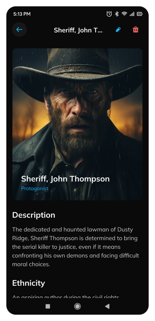 💡 Design intent: Humanize the writing process by giving visual life to characters, and allow deep editing through a clean, immersive layout.