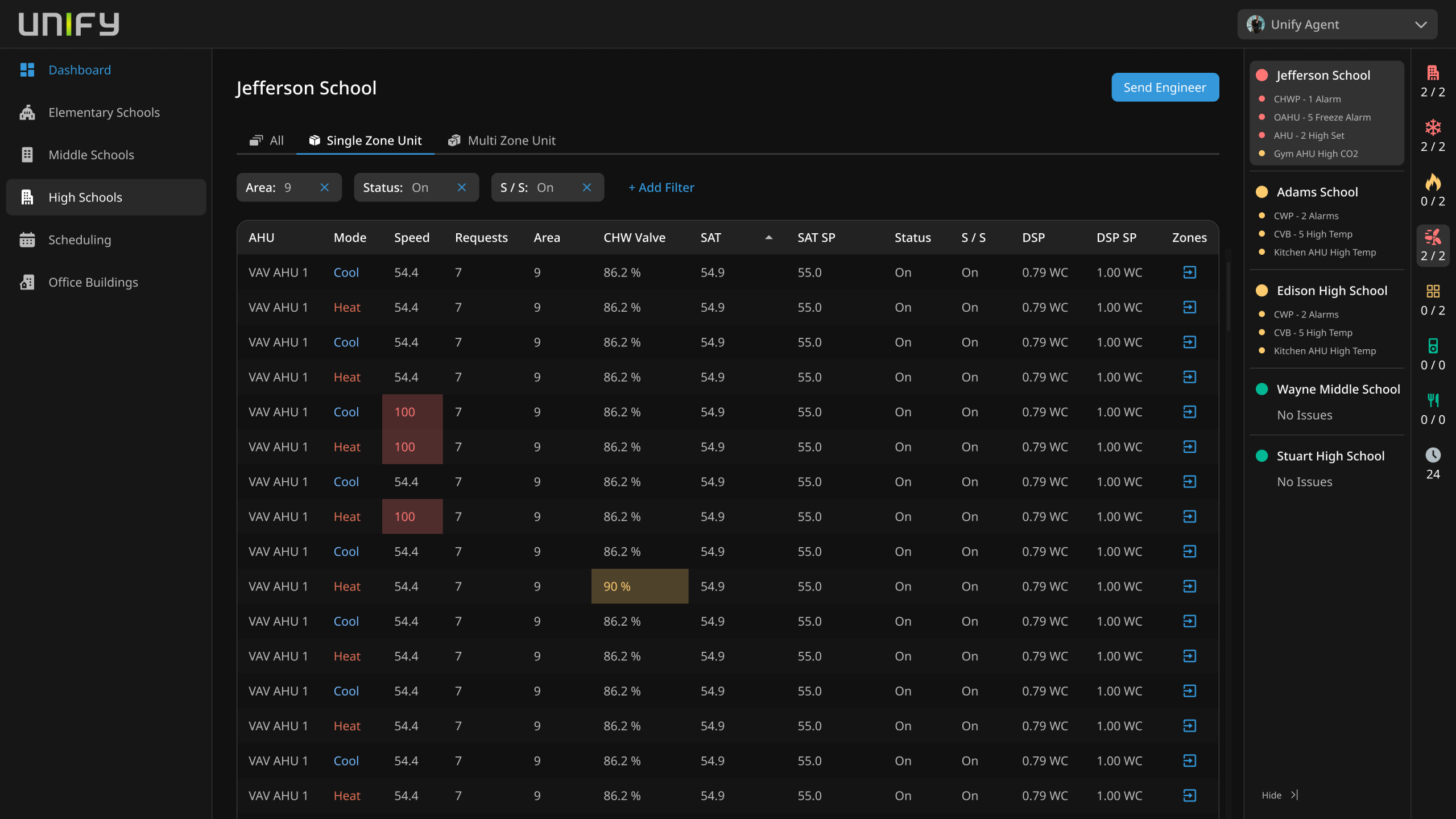 Create a unified energy management dashboard that allows users to quickly identify issues across elementary, middle, and high schools, schedule maintenance, and manage office building operations from a single interface. The design needed to balance dense data presentation with usability to empower swift decision-making.