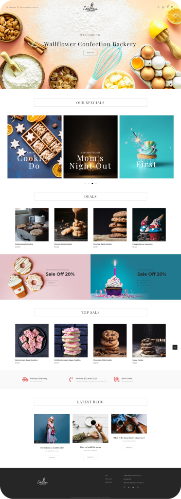 Wallflower Confection Bakery is a local Texas-based bakery specializing in whimsical, handcrafted sweets. The goal was to create an immersive online storefront that mirrors the brand’s playful and artisanal personality—while making online ordering and promotions seamless for their growing customer base.